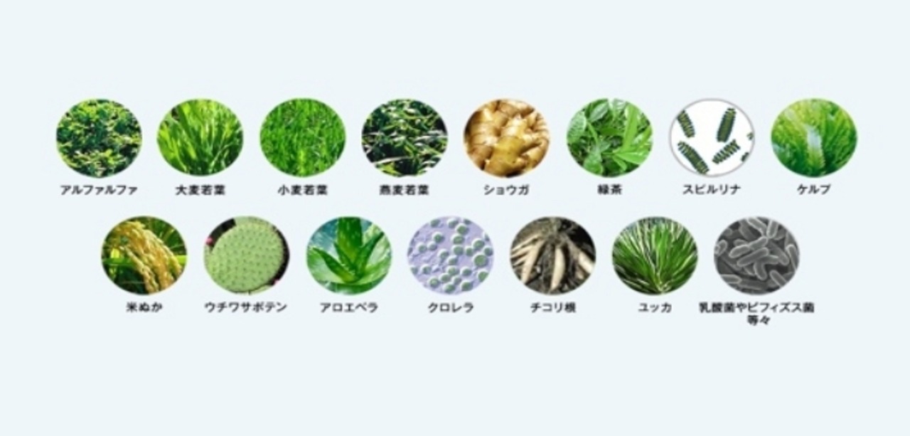 【原材料】アルファルファジュースパウダー 、 チコリ根 、 スピルリナ 、小麦若葉 、 燕麦若葉 、 大麦若葉 、緑茶、 クロレラ 、米ぬか、ウチワサボテン、パイナップルパウダー、ショウガ、 ケルプ(海藻末)、ダルス(海藻末)、アロエベラ、 乳酸菌(ラクトバチルス ガセリ)、ビフィズス菌(ビフィドバクテリウム ロングム、ビフィドバクテリウム ビフィダム)、ユッカ/甘味料(ステビア)